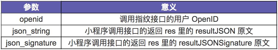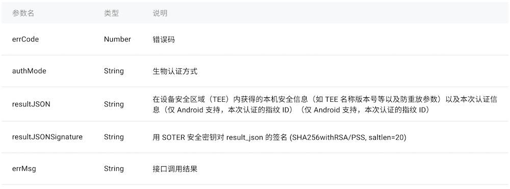 如何鉴别指纹信息的真实性? 如果你的小程序没有非常严格的安全要求(例如,数据存储在本地的日记本小程序等),到这一步已经可以结束了。 但 如果你的小程序需要更强的安全性(例如金融交易类的小程序) ,你还要确认指纹信息的真实性,以防有人以伪造数据的方式,破解指纹验证。 调用 wx.startSoterAuthentication() 接口后, 微信会向小程序返回指纹识别数据。开发者需要根据这些数据,进行进一步的验证。 1. 接口会返回什么信息? 调用 wx.startSoterAuthentication() 接口所返回的数据示例如下: