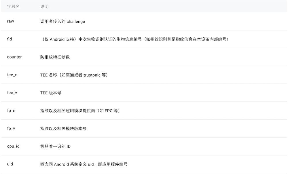 requestAuthModes:允许的生物鉴权方式,以数组的形式呈现。需要指纹识别,只需填入'finerPrint'。challenge:官方称为「挑战因子」,可以将请求特征码(订单号、请求编号等)放入,确认用户的是授权哪一个请求。authContent:在指纹识别的对话框中,向用户显示的提示信息。
