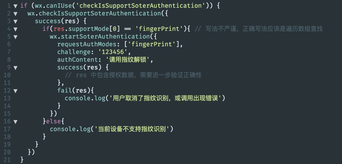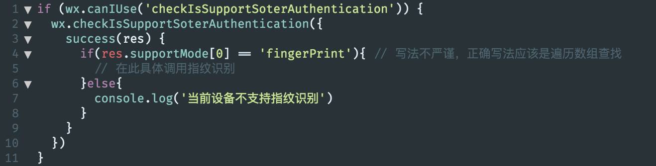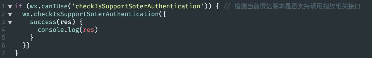根据两个接口的名字,我们可以知道:前者用于检查当前设备是否支持生物识别,后者则是实际调用指纹识别的接口。 那么,整个调用过程的逻辑就很简单了: 先检测当前设备和微信版本是否支持指纹识别,如果支持,则调用指纹识别进行鉴权。 1. 如何检测是否可以调用指纹识别? 利用wx.checkIsSupportSoterAuthentication() 接口和 wx.canIUse() 接口, 我们可以检测小程序在当前设备上,是否可以使用指纹识别。