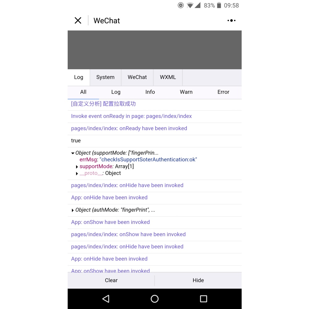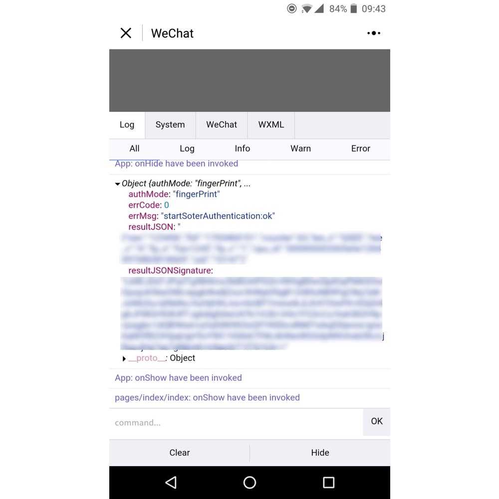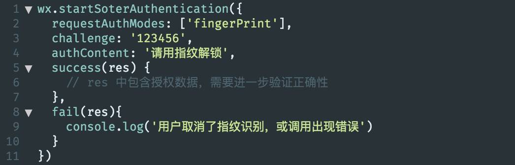 但据知晓程序测试, 如果直接调用,会出现 48001 的错误,并提示 API 未授权,目前不知道哪些小程序可以使用这个接口验证指纹信息。 有兴趣的同学可以自行尝试,并将结果告诉我们。 我们也希望微信官方可以继续完善这个接口(和文档),让开发者更方便地利用指纹接口,开发出具有高安全性和体验良好的小程序。