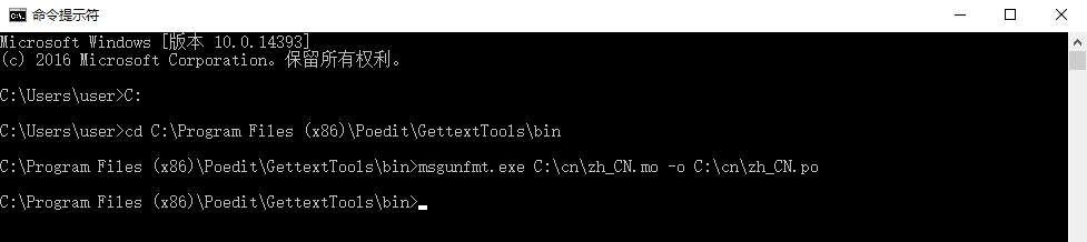msgunfmt.exe C:\cn\zh_CN.mo -o C:\cn\zh_CN.po